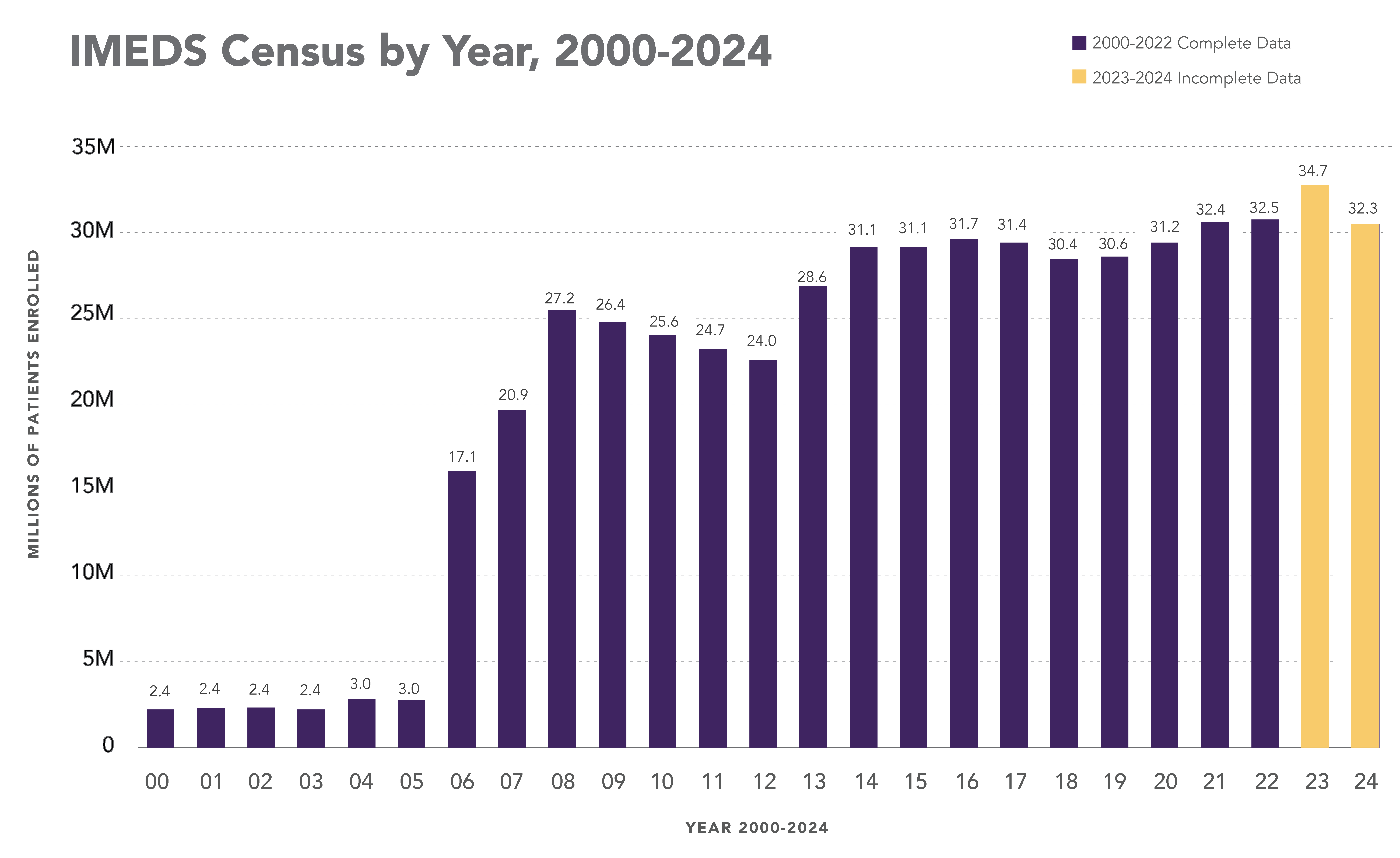 IMEDS Distributed Network includes nine Network Partners (NP), with the majority of the IMEDS NPs overlaps with the Sentinel Distributed Data Network and contribute the data and scientific expertise IMEDS leverages to conduct real-world evidence projects including Post Market Required (PMR) studies. The graphs below represent data from seven network partners from 2000 through their most recently available data as of July 2023. The recency of data varied across NPs, with the most recent data available ranging from December 2021 – July 2023. Queries were run using Sentinel distributed query tools.